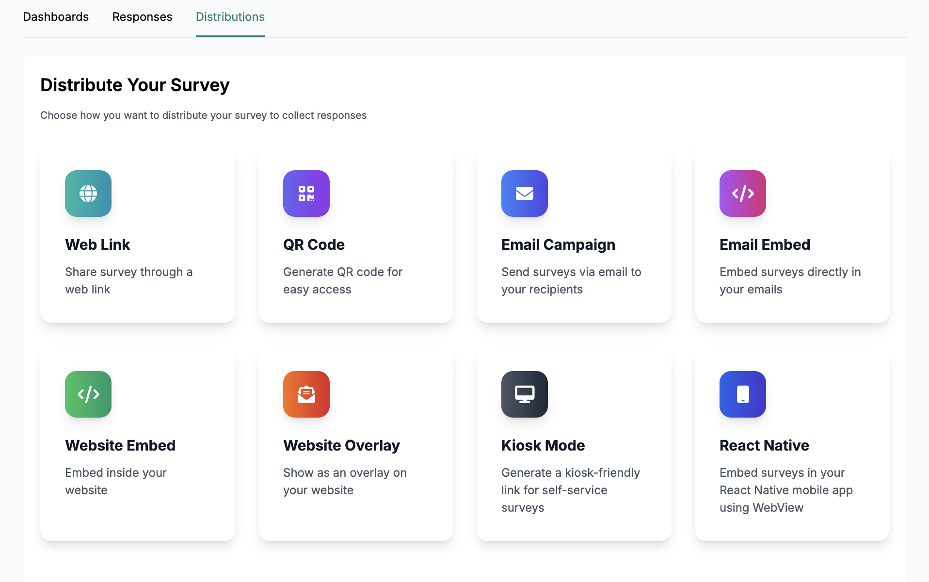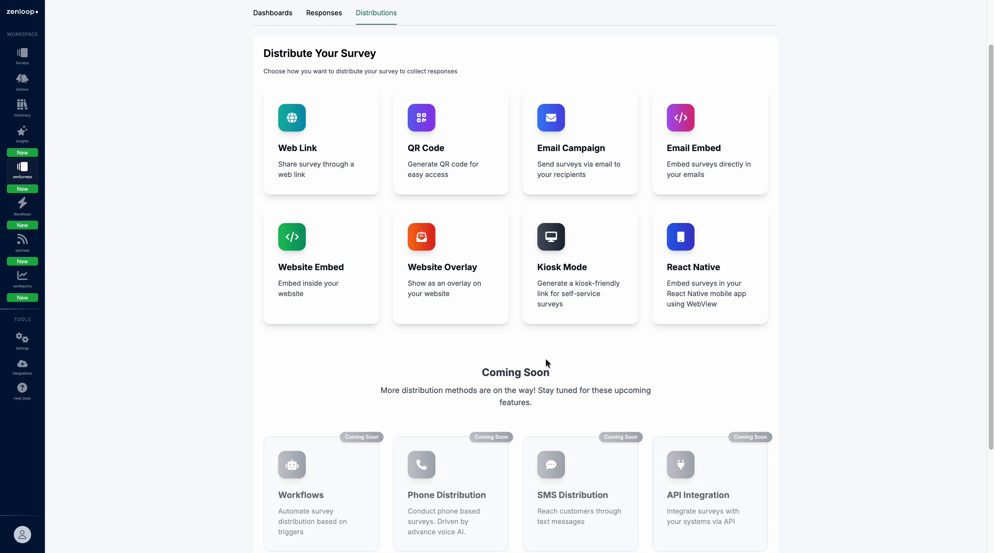 zensurveys offers 8 ways to distribute surveys. Pick the one that matches how you want to reach your customers: