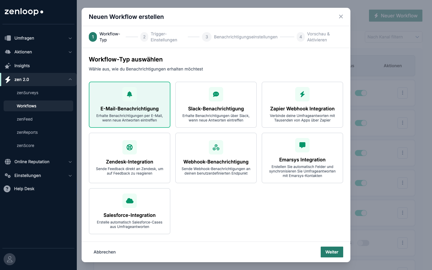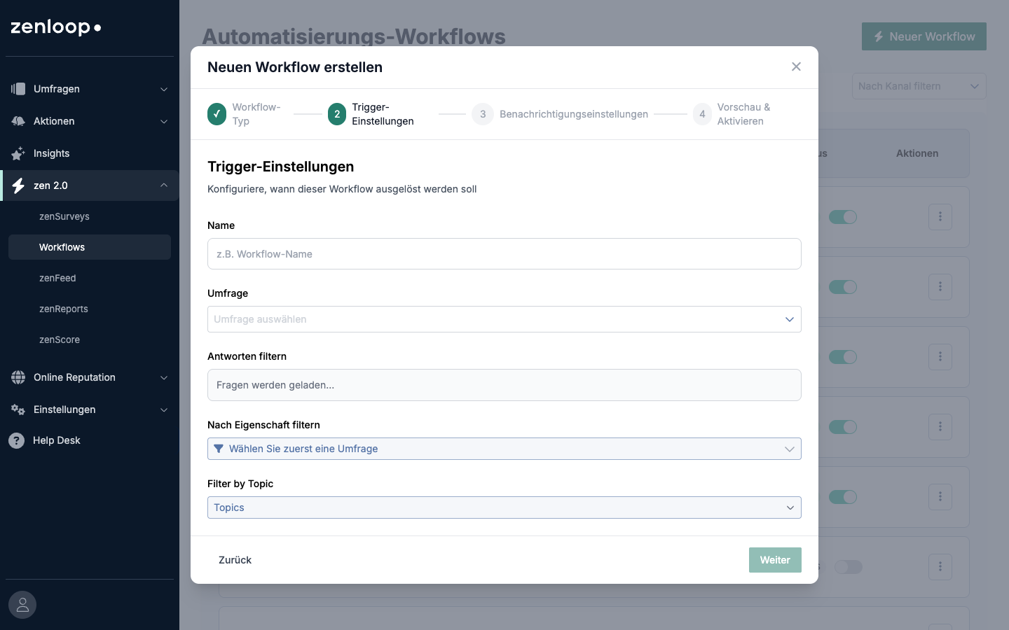 Every time someone submits a survey response, zensurveys checks your active workflows: